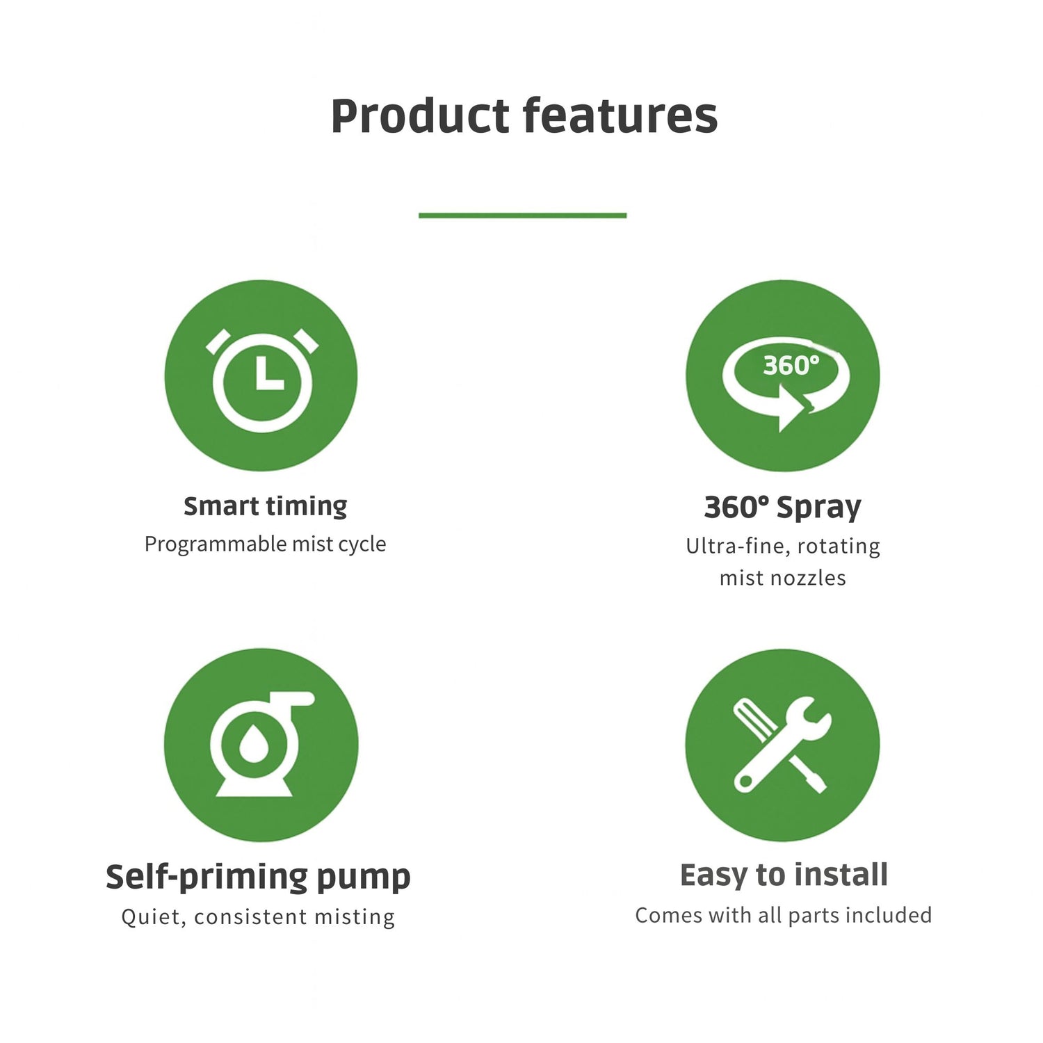 - Hands-free misting in busy or large setups