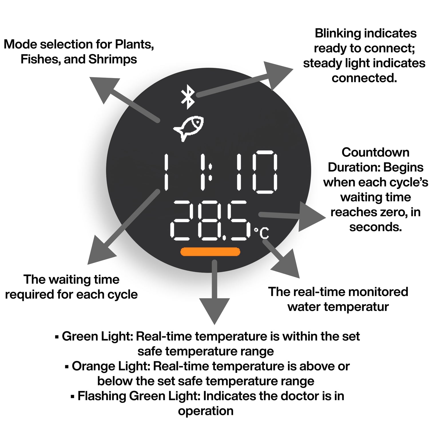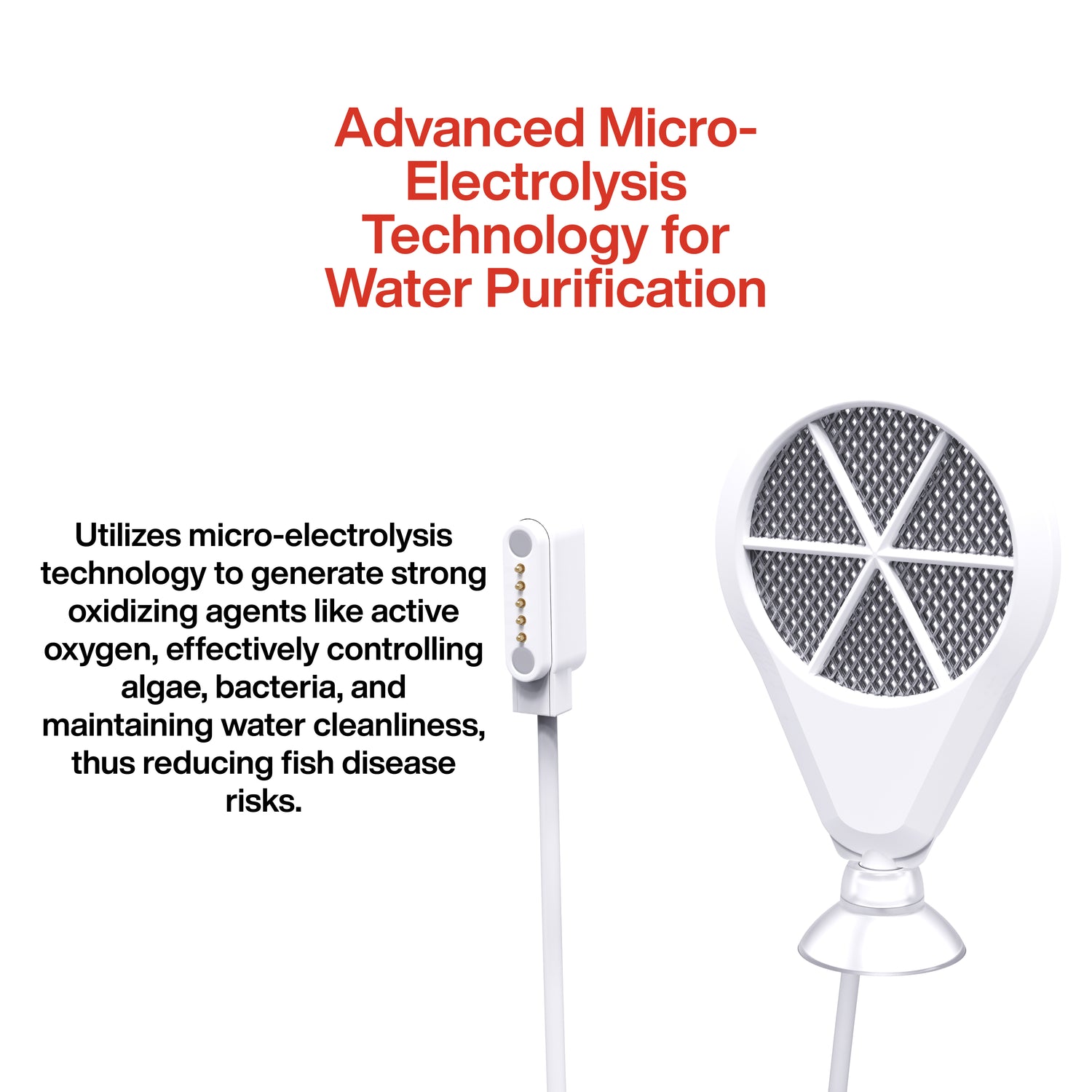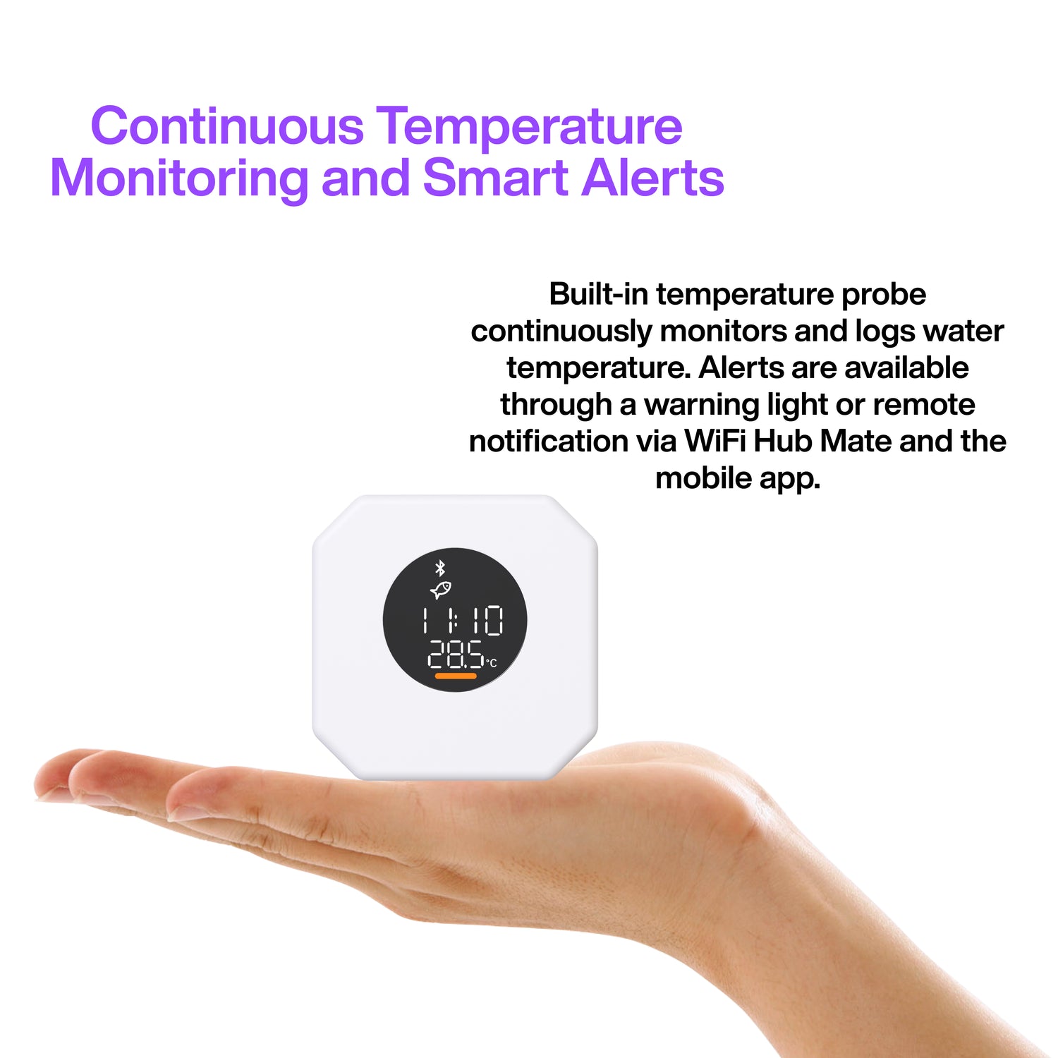 - Functions: micro-electrolysis algae control program; continuous temperature display & logging; app scheduling & mode selection; visual alerts on device; remote notifications when paired with Wi-Fi Hub Mate.